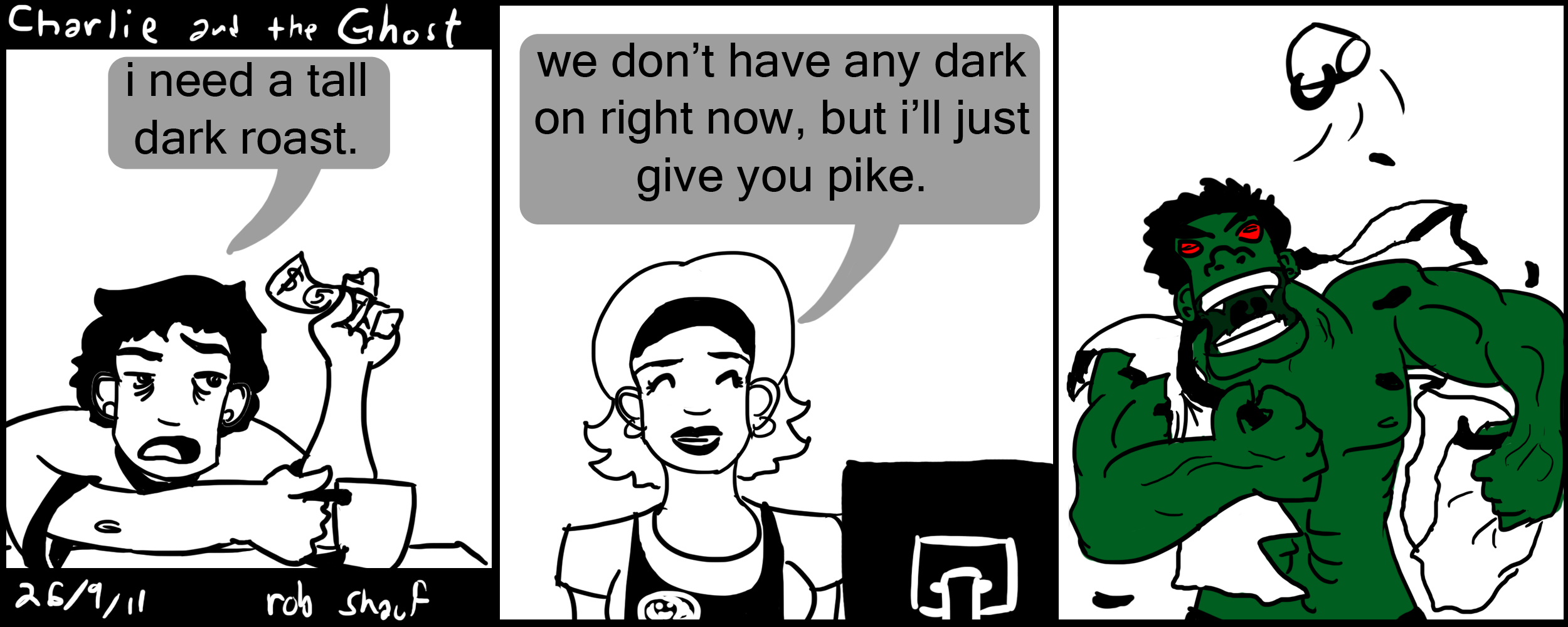 But anyways, this strip was inspired by the real Charlie! As in, Charles. Also known as Karl Anderson. It is also inspired by the fact that Starbucks always seems to be brewing a fresh pot of dark roast whenever I get to the front of the line, and they always suggest medium, which used to be pike place, but now that I think about it, is it still? or do they call it house blend now? anyways…