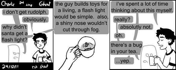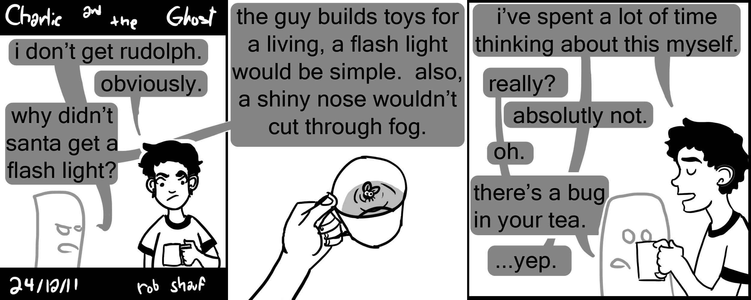 As you may have noticed, i have missed my thursday and friday updates this week! this is because I was animating like MAD to get my first ever, long-short finished. I’ve been toying around with animation for different church things… it’s always been a dream of mine to make a cartoon! Anyways, you can find it posted at my old tumblr account robshauf.tumblr.com so check it out! This next week might be pretty sparse in terms of charlie and the ghost updates! Regular updates again on January 2nd.