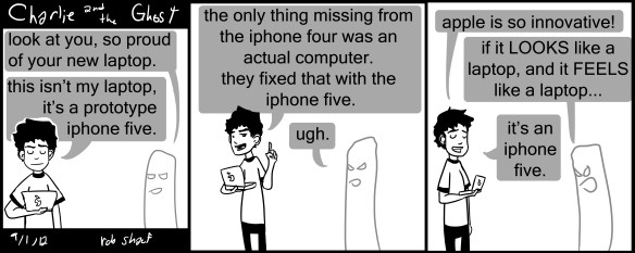 honestly, this would be the simplest solution to the iPhone five problem…. which is, i think, this: everyone likes the iPhone 4, and the iPhone 4s, but androids are pretty dang cool, and I think people are making the switch purely because the screen is big enough that you can see it. The trump card: Make the next generation of iPhones into the current generation of MacBooks. it would save apple development costs, cause they already make MacBooks. People wouldn’t mind carrying them around, i’m sure it could be marketed as a north american status symbol! Bigger is better! If android phones have a screen that is twice as big as the iPhones, how much more awesome would it be if your iPHONE was eight times the size of an android phone!? Plus, it would be a good workout! Good for the ol’ health meter. They can put a spin on that, apple has the best ad men in the world!