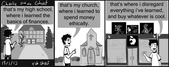 “the idea for this comic was jotted down on the iPhone, concept sketched and pictured into iPad, then, drawn on my macbook pro, while my other macbook streams CSI to my TV, and the iPod classic charges on the dock to get ready for tomorrow, while the iPod touch updates to the newer version of bejewelled, and the other iPhone is charging and being used as an alarm clock, and the other OTHER macbook is playing soft music in the other iRoom for the iWife.”