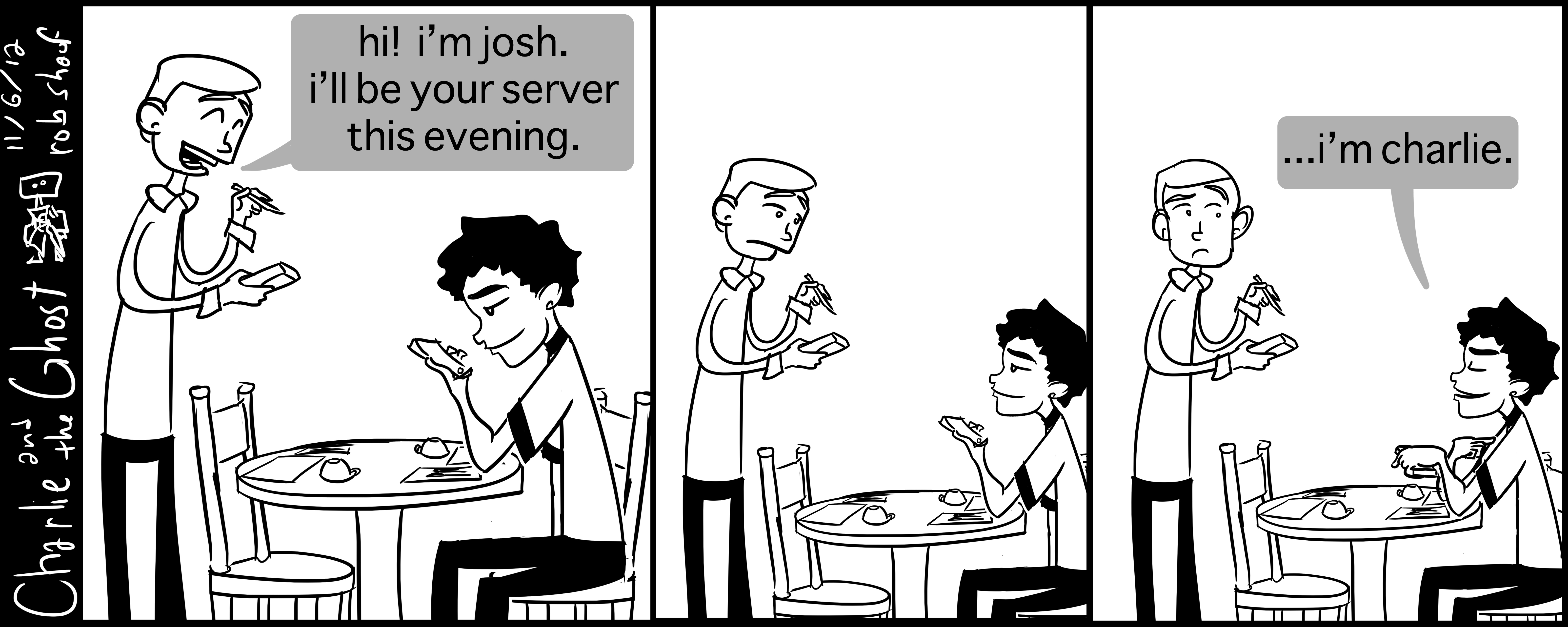 So it is me and Diana’s one year anniversary this day! woot. We couldn’t get a whole lot of time off for it between our two jobs, so we are currently in a quick two day vacation to a city that is close by! (vancouver, obvs.) Anyhoo, restaurants. Diana loves to shop, and I don’t, so i went into a restaurant to get us a table while she looked around a store. the above happened. it was weird. it may not seem like that big of a deal, but really, REALLY, think it through. Do you ever introduce yourself to your server at a restaurant? This guy was like, digging for it. He’s like “My name’s Josh, and….” and giving me this look, like i’m supposed to reciprocate. He waits for it… for like, a solid five seconds. then he stares at me and walks away. it was BIZARRE.