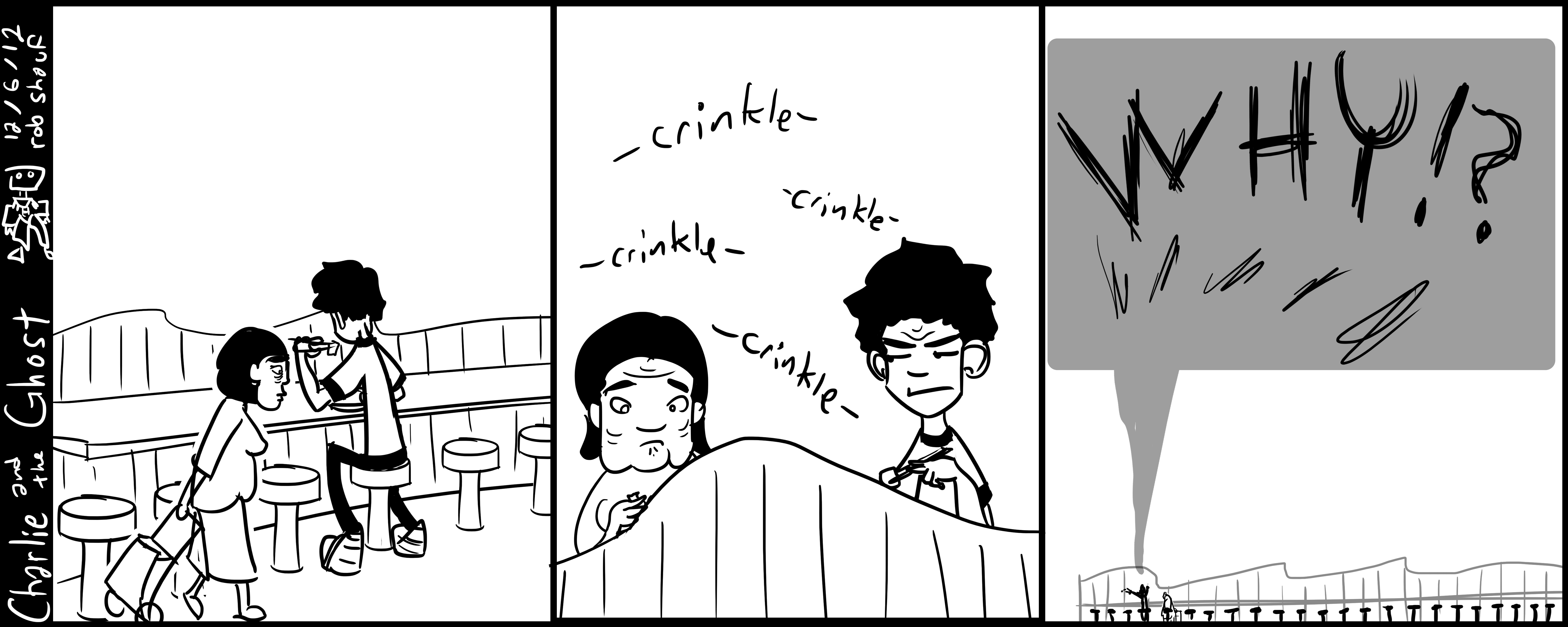One thing i love, probably the thing i love the most, about being in the city is all of the super random crap that happens. It’s almost like I have to walk around with a pad and paper and just write it all down, before i forget it! When Diana used to live here, and I would visit every weekend, I never had a shortage of things to draw or write about. Anyways. this is another “actually happened” comic. We’re in the food court. I’m eating my fake-chinese food, minding my own business, when suddenly, a lady sits beside me. Right beside me. i’m sitting at the “bar seating’, which has like 25 open chairs in EITHER direction…. and she picks the one RIGHT beside me, and starts eating really weird, celophane-wrapped food very loudly. I was so annoyed. Anyways… I’ve come to realize that much of what inspires these comics are things that annoy me. Plus! in the city, how is it that so many old ladies have those little pull-carts? where does a person even BUY one of those? what do they even keep in there? Diana laughed at me being annoyed by it and said that i wouldn’t do well in a hot culture… but i think it’s just that i’m not used to hot-culture stuff in good ol’ cold-culture canada. Or, maybe i just like eating in privacy.