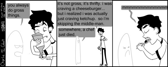 fast food jobs are great. I’ve worked at, to one degree or another, McDonalds, Burger King, Ciniplex concession, and Dairy Queen, as well as a couple non-fast-food-restaurants. They have much in common! namely, the word of the day. Catsup. Ketchup. When I had no money at all, and I would crave a cheeseburger, I would go to the grocery store across from the apartment, buy a bag of wonder bread and some no-name cheese slices, and then make grilled cheese sandwiches and dip em in ketchup, which basically satisfied my craving. Yesterday, I went to McDonalds to bug a youth that started working there, and i got my cheese burger, and it was dripping with ketchup, and I took the ketchup container and spread it out, so-as to dip the burger in it, and i had the realization i present to you in comic form. Viva heinz!