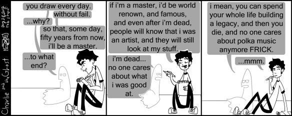 sometimes, I wonder why I draw every day. to what end? is the goal to be famous some day, cause as much fun as that would be, I am incredibly uncomfortable with most of what fame would require. Is it the gratification of knowing I can put to paper anything I imagine? cause that’s a bit of a bottomless pit, there’s no end to that. hmm.