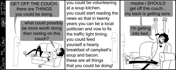 So, urgh! How best to decide what to do with your free time? I have about a half an hour right now before I go into the office. I could a) play the sweet transformers game i just bought (I didn’t get the new one, the older one) b) read a book in the bath (which does two things: it cleans me, and it is entertaining) or c) watch netflix (which gives brainrot, but can be entertaining) or even i could do exercise maybe? not to mention i’d like to draw more and record music again. Anyways, happy monday. I mean tuesday DANGIT