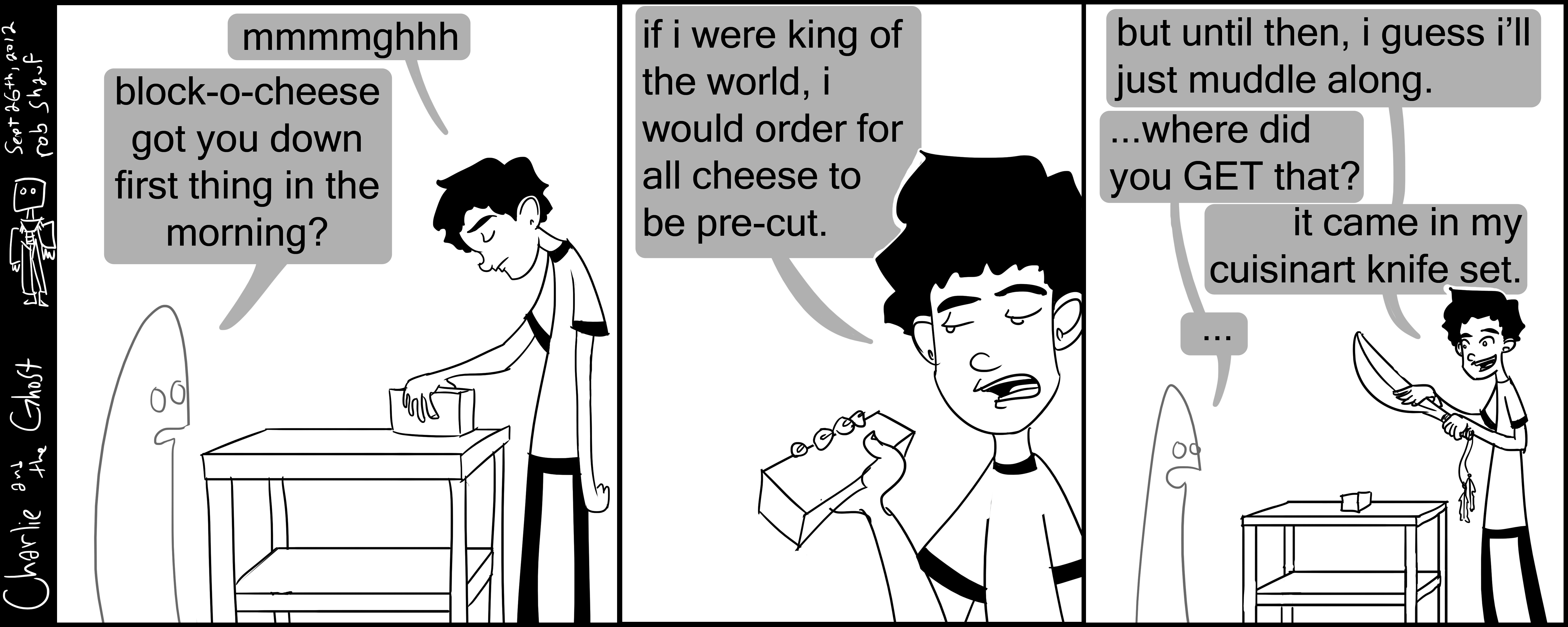 All fart jokes aside, is there anything worse than cutting the cheese first thing in the morning? no. The only time in my life this has ever been an enjoyable experience is when I would stay at my grandpa and grandma’s house, and they have a piano-wire cheese cutter… that thing slices through medium cheddar like a DREAM. But I don’t have one of those, we just have a ridiculously equipped cuisinart knife set. the other day, my loving beautiful wife was carving the core out of an apple with a knife as big as my fore-arm… it’s like, under what circumstance would a knife that large be needed? Now i’m no Joe-kitchen, but I do understand that larger knives are ideal for things like chopping, but this knife is shaped for stabbing and slashing! It’s like a dagger. It might as well be a machete. In any case, BE CAREFUL in the kitchen you guys. Boiling water, sharp knives, it’s like a medieval epic in there.