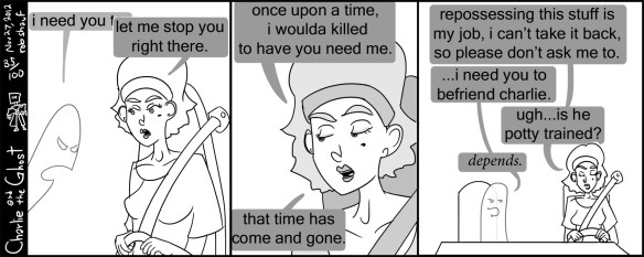 So you would not believe how long the dialogue on this took. Why? Ugh. I have no idea. There are so many different directions this was going to go; some directions would have been really wordy and wouldn’t of helped further the story, some directions would have made the next 65 strips incredibly uncomfortable… But this is the direction I am happy with.