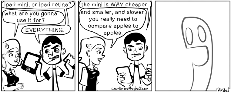 They really are two very different devices! I remember when the iPad first came out, people thought it was dumb because it was just a big iphone. I love my iPad; i saw and got to play around with an iPad mini, and it was pretty cool too, but i wouldn’t work at all for what I use my iPad for… despite its attractive price point, it would be a waste of money if I were to buy a mini for myself. Anyhoo! Thanks to the people who checked out the store page! If you are interested in purchasing a book, you can either do it online through lulu, or you can get one from me! just drop me a line if you want a book and don’t want to order it directly. Peace out!
