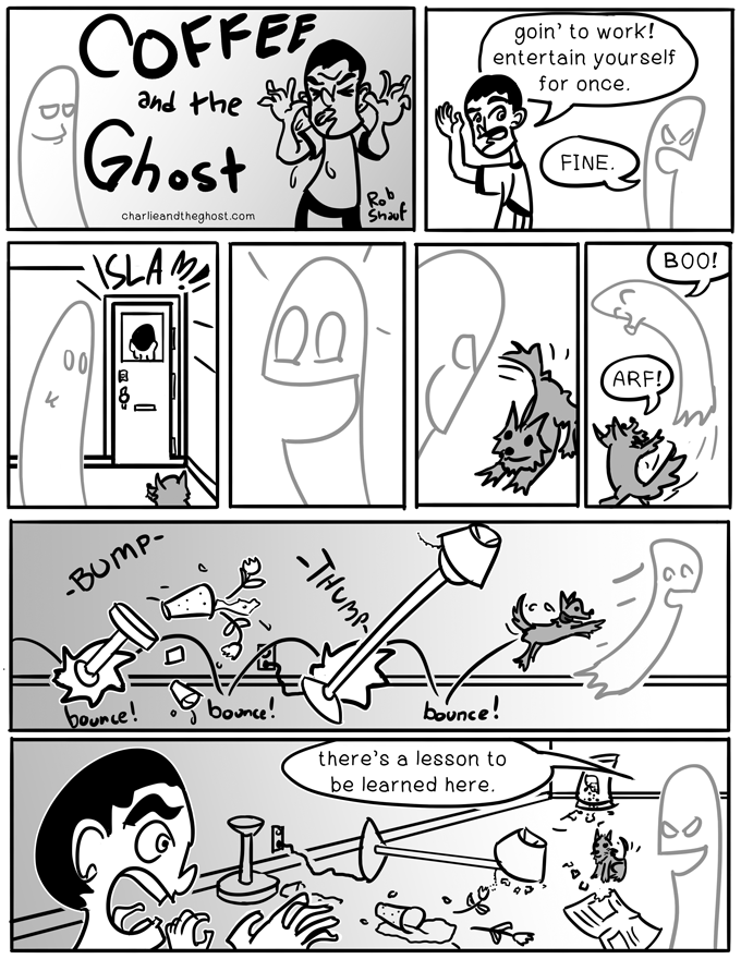 In reality, Coffee the dog isn’t big enough to knock anything over. I think I’ve seen her almost knock over a glass of juice precariously perched on the unstable fibres of our living room carpet, but as far as dogs go, Coffee seems to be incredibly aware of everything, and terrified of most of it. Have a great day everyone! If you like the strip, consider sharing it on your facebook profile? Or, purchasing a book in the store? Both of these things help me to continue makin’ these here strips!
