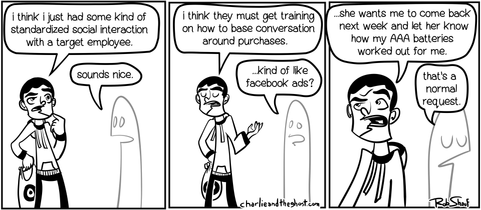 SNL has it 100% right. I can’t remember if i have already made this comic, or if i’ve just talked about it in a blog post, but every time i go to target, this happens, and it always strikes me as very friendly, and then odd to the point of desperate…. which i suppose is why the SNL target lady exists! anyways, my own personal target lady moment, almost exactly.