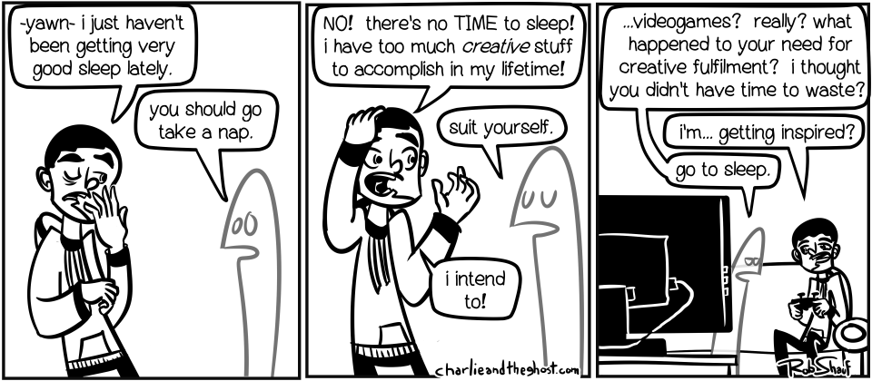 I’m really tired, but I don’t want to sleep, because If I sleep, I won’t be making any of the stuff I want to make. BUT, i’m so tired that I don’t feel inspired in ANY WAY to make anything anyway. SO, do I sleep, and not have time to make anything, or stay awake, and make stuff that isn’t of any importance what-so-ever? Sleep and feel guilty, or stay awake and feel frustrated?