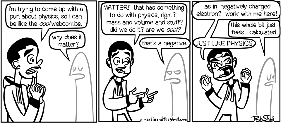 There are plenty of good comics, like XKCD, and diagram comics, and other poorly drawn math-or-science based gag-a-days that are really funny/require me to scour wikipedia to figure out why it’s a good joke. MY comic has never been one of those. There has been the odd two-level pun, but I leave that to my friend Steve Berk! no, no… Good ol’ Charlie and his transparent friend do not fit into the category of “intellectually stimulating”. Well, I mean, hopefully they are in their own way! I’ve got a couple puns going on here, but i mean, some of them require some pretty odd mental gymnastics… Let’s see, I count… 4? Hopefully there are more accidental puns!