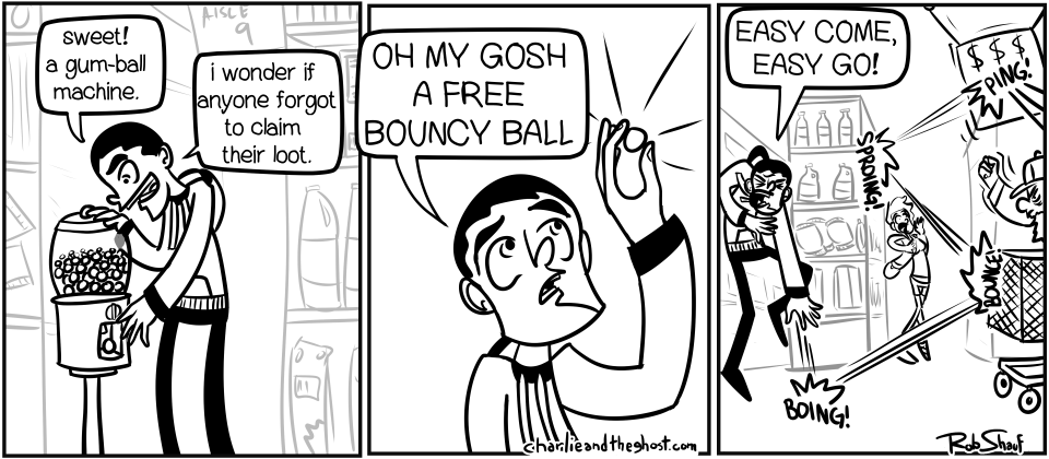 This comic is 100% inspired by my brother, who found a free bouncy ball in a walmart vending machine yesterday. Why do they even still make bouncy balls? Kids get them, and disaster ensues, and it ends in tears, because those balls are uncontrollable.