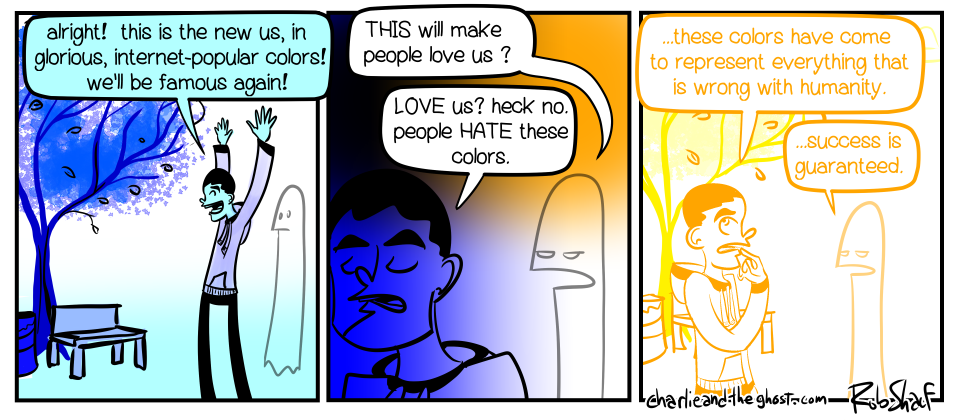Like that star trek reference, soon too, the joke behind the color scheme of this comic will fade out of immediately accessible public knowledge. So I will offer my summery for reasons of posterity: