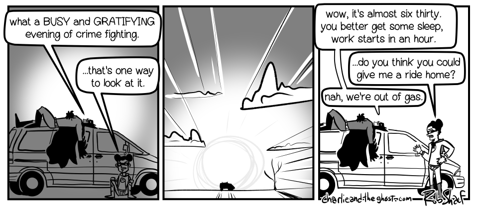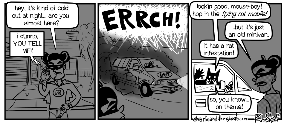Well, here ends a second week of Flying-Rat-Man escapades. The only thing more fun than super heroes are inept superheroes… which is, i guess, why “the Tick” and “Earthworm Jim” and “Darkwing Duck” and whatnot will always have a special place in my heart. Deadpool, etc. Good times!