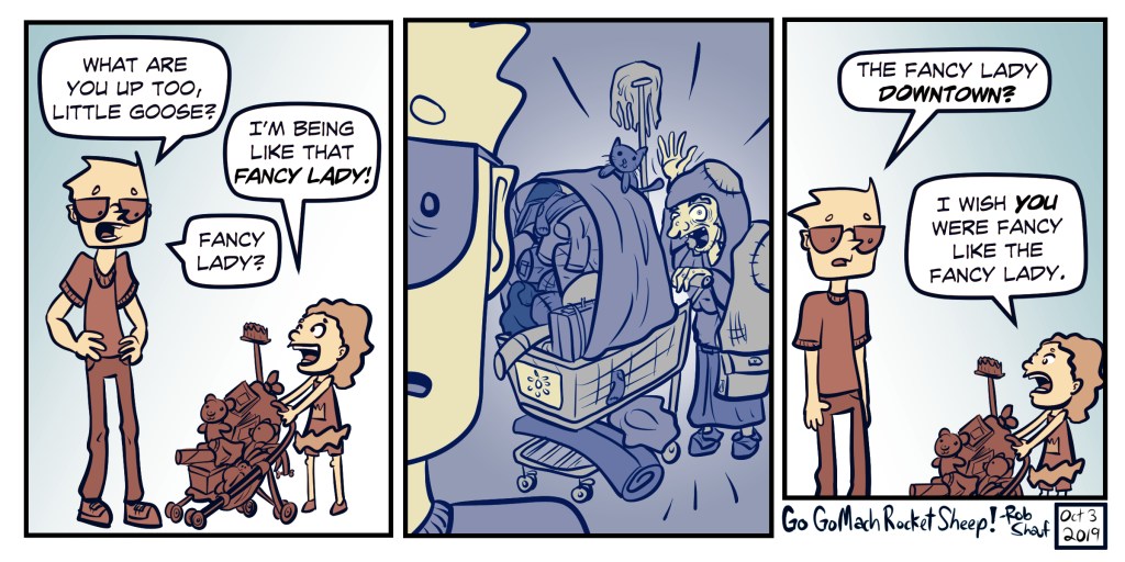 It took me a while to realize who she was talking about. Once I realized it, I Couldn’t help but smile. Of course she’d call her the fancy lady! She’s got all those jackets and dresses on, and she pushes around all her stuff. When I take the girls out of the house, I don’t let them bring toys and stuff, so it makes sense that she thinks it’s pretty fancy to have all your stuff with you when you’re out and about. I love my kid.