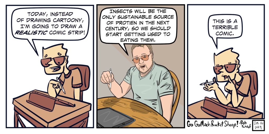Let’s get ahead of the game and start developing some good dishes you can make out of locusts and cockroaches. I know some countries have bug snacks like grasshoppers and ants and stuff, bagged like chips! They’ve got the right idea… rather than pretending it’s not insects, just go all in and own it.
