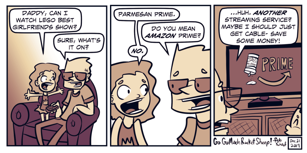 This is a true story (well, all except the last panel, although the thought has crossed my mind). Prime, Netflix, Disney +… I’m still under the cost of cable, but we’re getting pretty close, especially seeing as most cable packages these days offer streaming of episode backlogs.