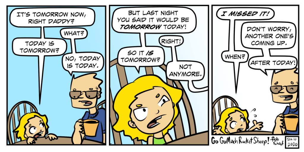 My daughter sure comes up with some doozies. I couldn’t get her to understand that tomorrow is whatever day is next, but she had it her mind that it was a day of the week. Monday, Tuesday, tomorrow, Wednesday, etc.