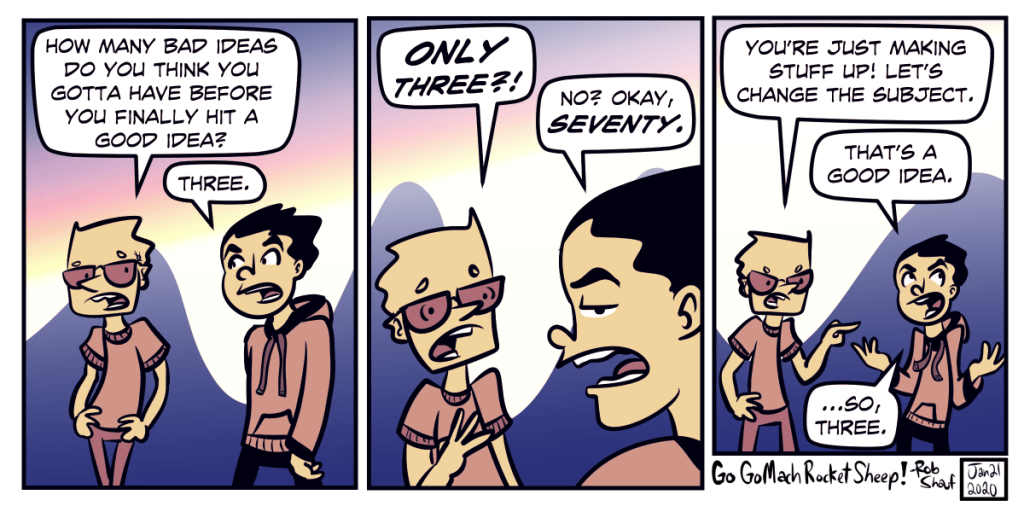 there is some debate as to whether or not a question can be an idea, or if it is the catalyst for an idea, but I think anything your brain generates is an idea, so I think it works. Today’s comic is the 150th comic strip of go go Mach rocket sheep, or as I’ve come to refer to it in my head, “GGMRS”, because that’s what I name the files. That’s in addition to over a thousand charlie and the ghost strips, and a couple space chuck graphic novels, and about a hundred half-started comic ideas.