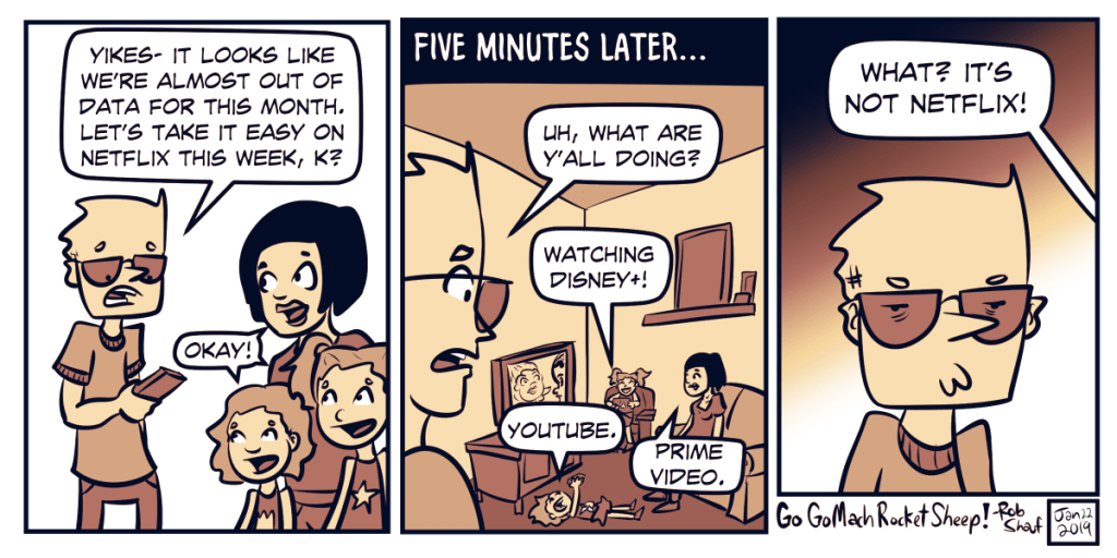 True story. A week of snow days means we worked our way through quite a bit of the Disney catalogue, caught up on new seasons of old classics, and somehow managed to obliterate our data cap (which, if I’m not mistaken, is 500 gigs a month). We got faster internet a while back, which came with a bump in data (from 300 gigs to 500 gigs) for ten dollars cheaper a month without a contract (go figure!), but it looks like even that isn’t enough if we’re all stuck inside streaming our own thing on different devices. Luckily for me, it’s definitely the odd month out, we don’t typically spend that much time watching tv.