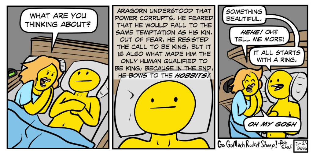 I really do love the lord of the rings. I watched the movies before I read the books, and I think the movies are excellent. The nice thing about the movies is that, with care, they really help to point out and demonstrate themes that are in the books that I never caught when I read the books because, well, I read them when I was young and frankly they were long and thick and I wasn’t a good reader at the time. It’s nice that the movies bring such beautiful ideas to re-expression, faithful to both the medium of film and the themes in the books.