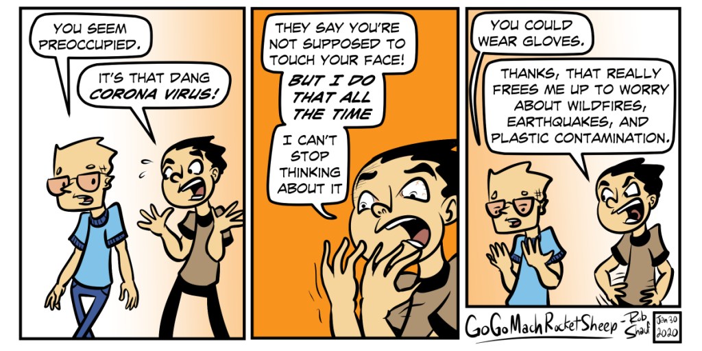 Or wash your hands regularly, or wear a helmet (full face visor), or just fill a bathtub with hand sanitizer and stay in there forever. No amount of reasonable precaution can get us out of our heads. It’s awful that people are dying of this, I hope they can figure it out and help people.