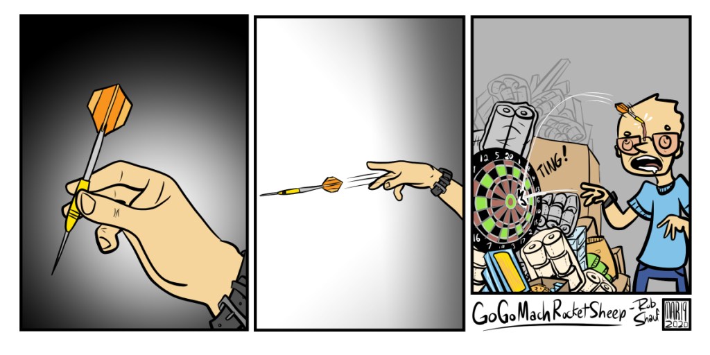 This is one of those rare times where I drew me, but this is in no way corresponding to reality. I don’t have a hoarded stash of toilet paper, and I don’t have a dart board (currently) and while I have had a dart ricochet wildly, it has never stuck into my brain rendering me a vegetable. But it was fun to draw! Thanks brother Andy for the idea.