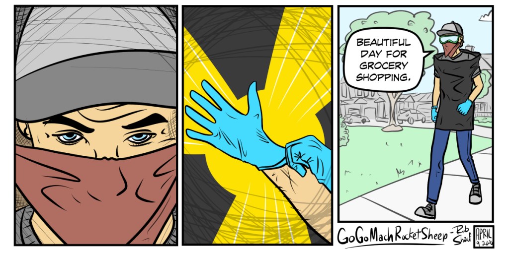 I went grocery shopping today. I wore a bandana as a mask, because I don’t have a mask. I didn’t wear gloves (cause I don’t have any) but most everyone else did.
