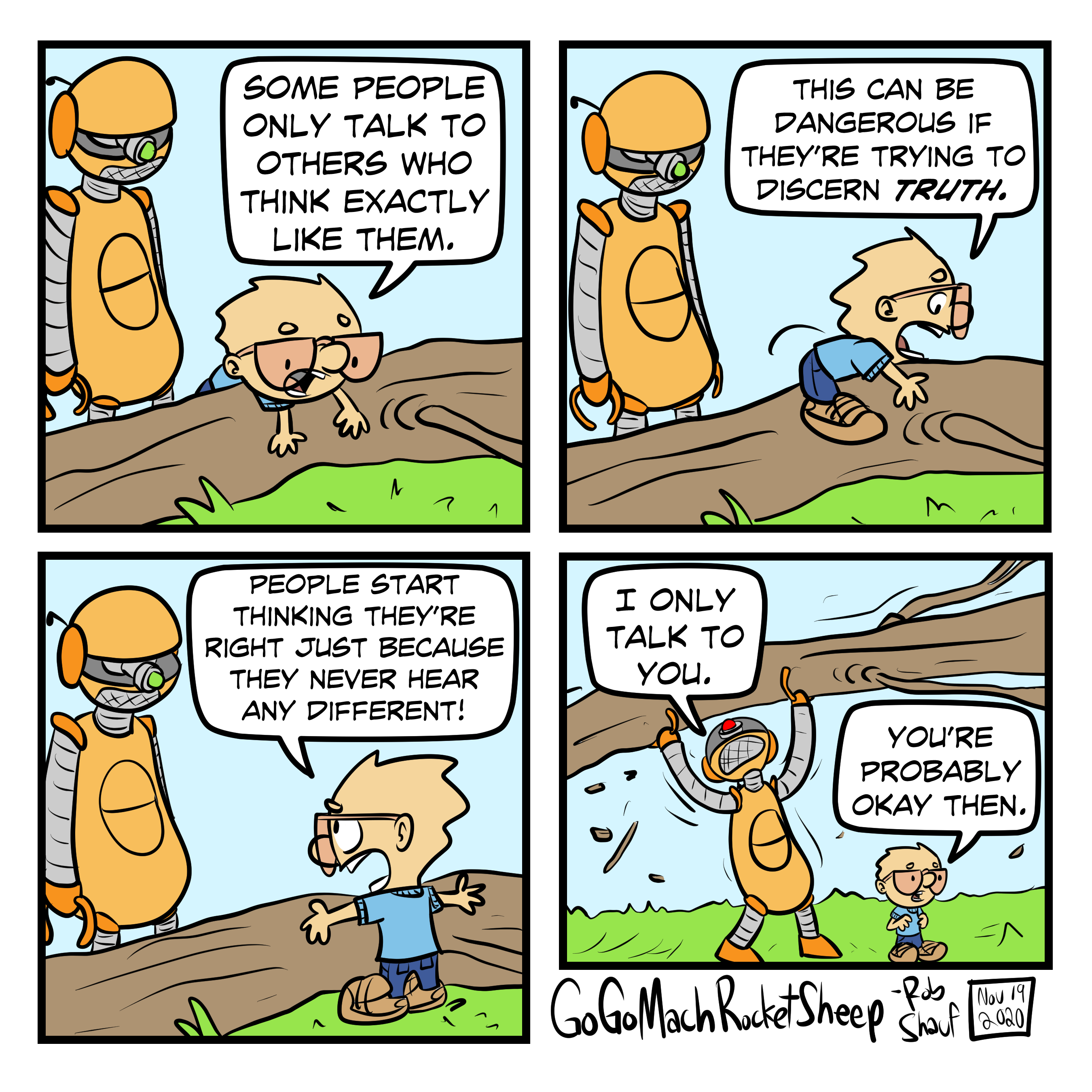 Echo chambers, confirmation bias, whatever you want to call it… when people go searching for truth but only consult sources that will agree with their opinions, the result isn’t going to be a surprise. How do we get out of this? I think by engaging in thoughtful conversation with people who don’t agree with you on everything you’re wondering about. Is that easy? Surely not. In fact, sometimes it’s repulsive. But it’s important. Or at least I think so.