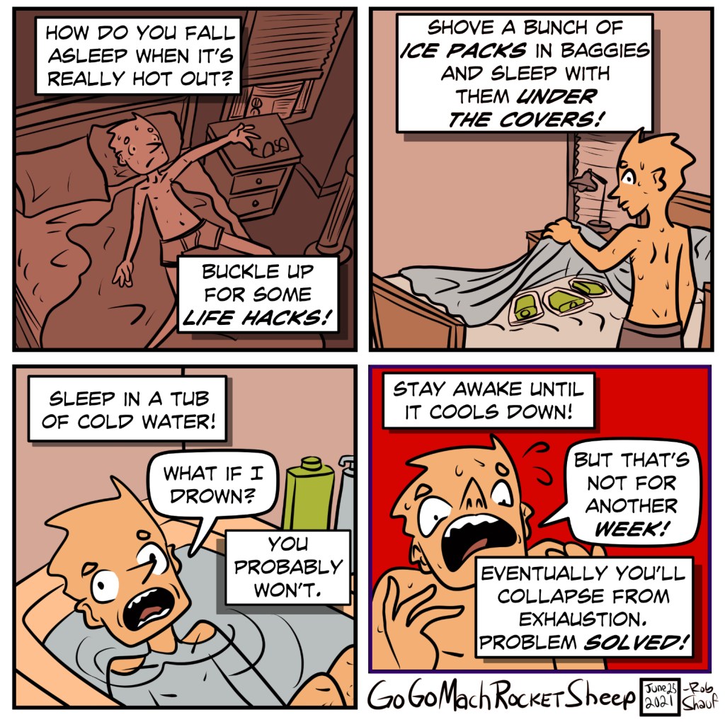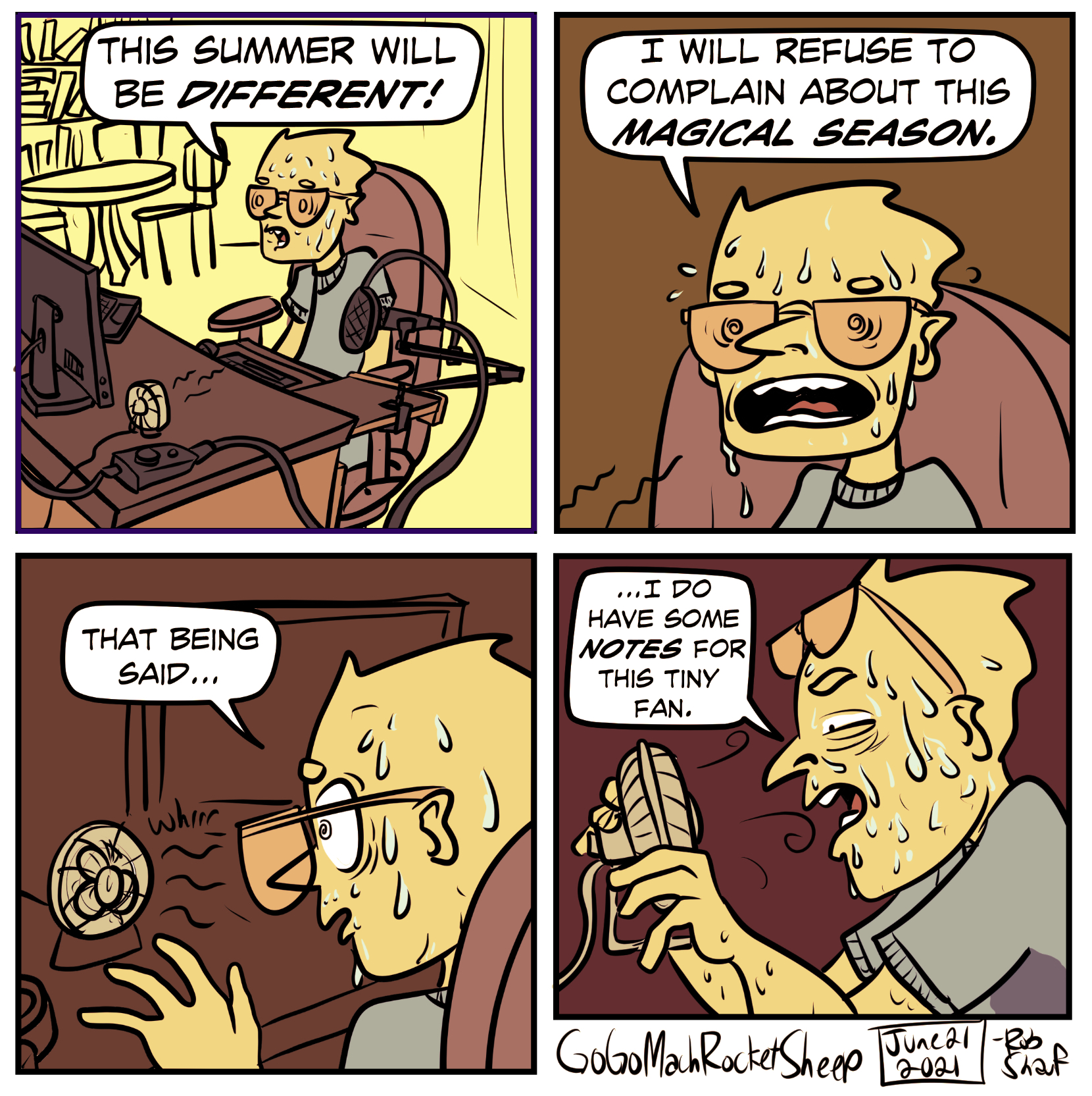 I’m writing this at six in the morning, sitting in a nicely air conditioned room. Outside of this room my house is about 25 degrees celsius, which is as cool as it got last night. Today- it’s supposed to get up to 43 degrees celsius, which will be the hottest it’s ever been in my little town (at least, for as long as I’ve been living here). STILL, I refuse to complain about the heat- every year people complain about the weather. If it’s hot, it’s TOO hot. If it’s cold, it’s TOO cold. Well I’m trying my darndest to channel those feelings into comics, which should be evident this week! 😀