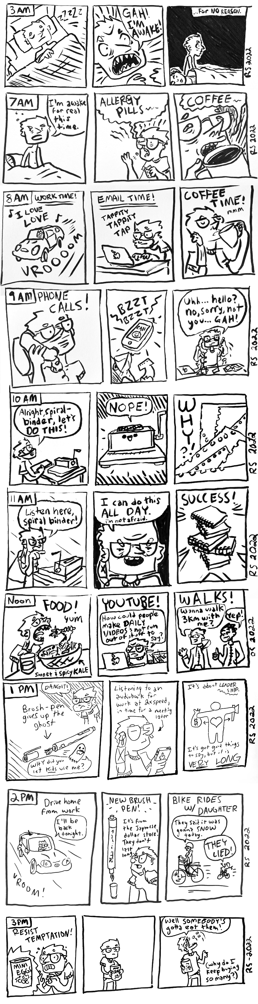 This week was actually pretty productive from a comic making perspective because Feb 1st is HOURLY COMIC DAY! Every waking hour, I took five minutes to sketch out what I did in that hour.