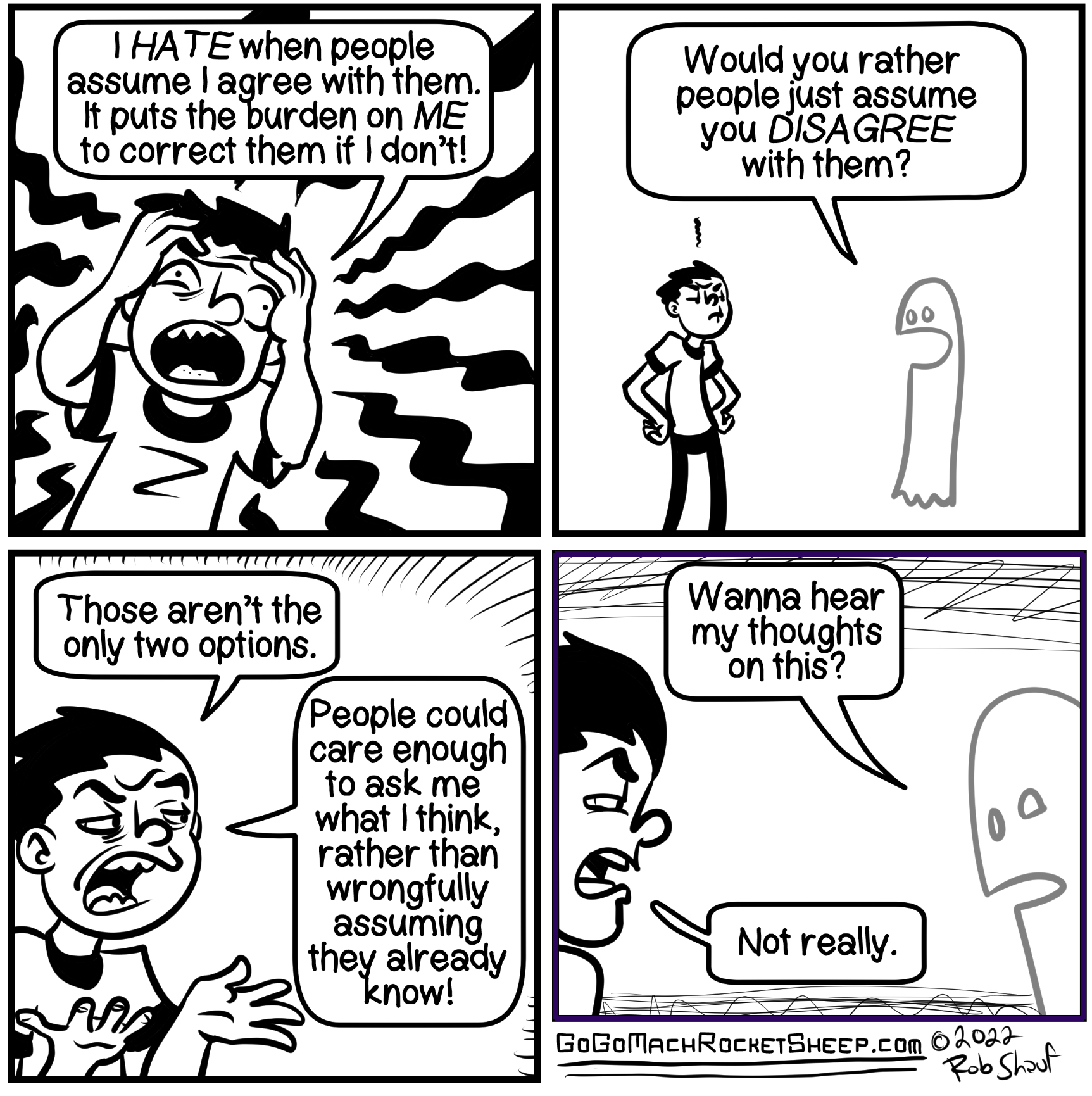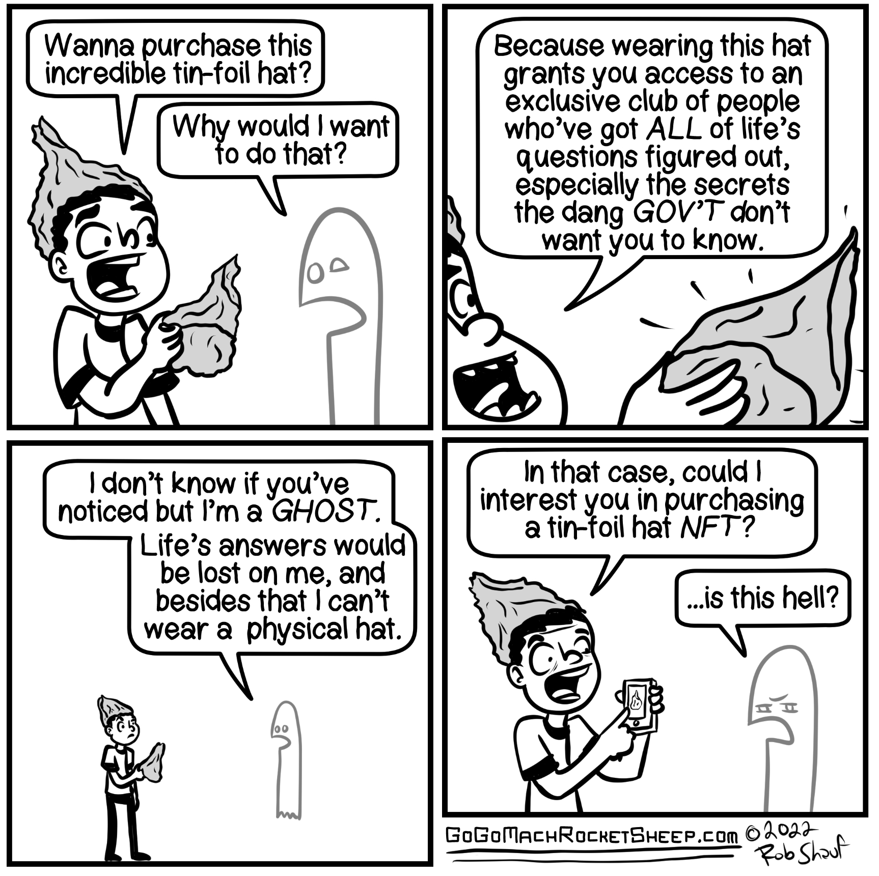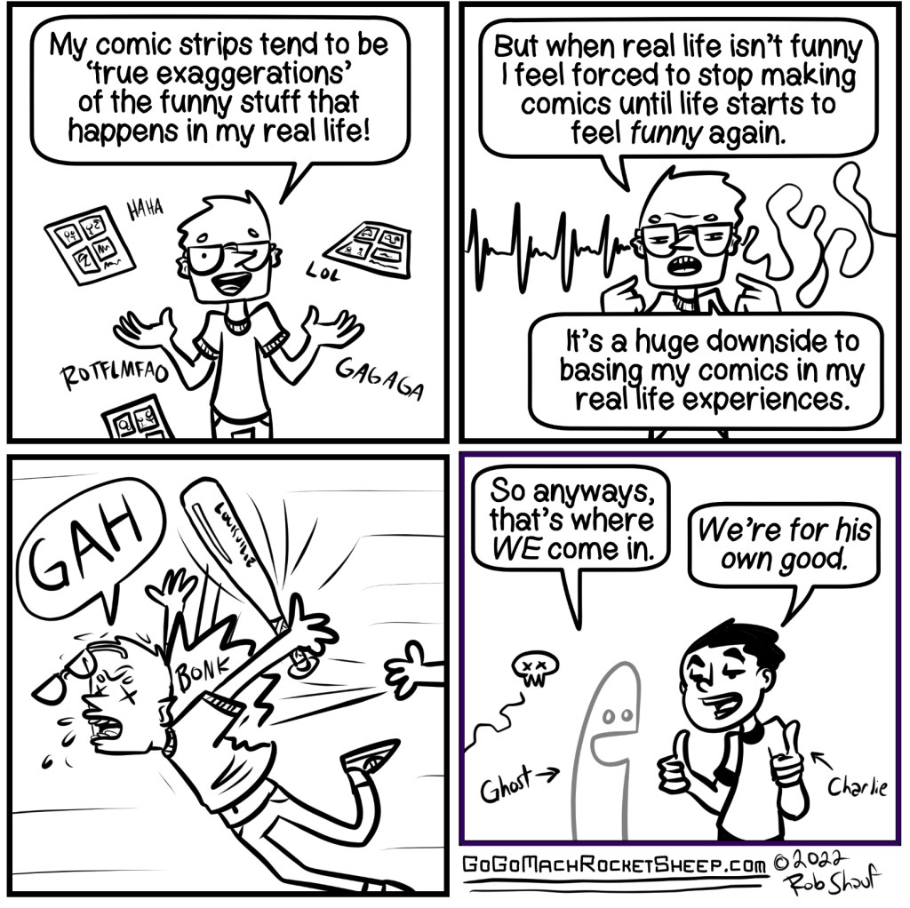 I love making comic strips for many reasons, but one that I always seem to forget is that they are a useful means for me to try to work out my thoughts… Especially when I made “charlie and the ghost” comic strips because they weren’t based in anything specific in my life and allowed me to try and make rants entertaining and accessible (while also helping me to work out my thoughts on a variety of subjects!) Anyways, I made charlie and the ghost for almost 10 years before I took a break and shifted into space chuck, then took a break from that and started GoGoMachRocketSheep. I might be drawing these for a bit, I hope you like them!