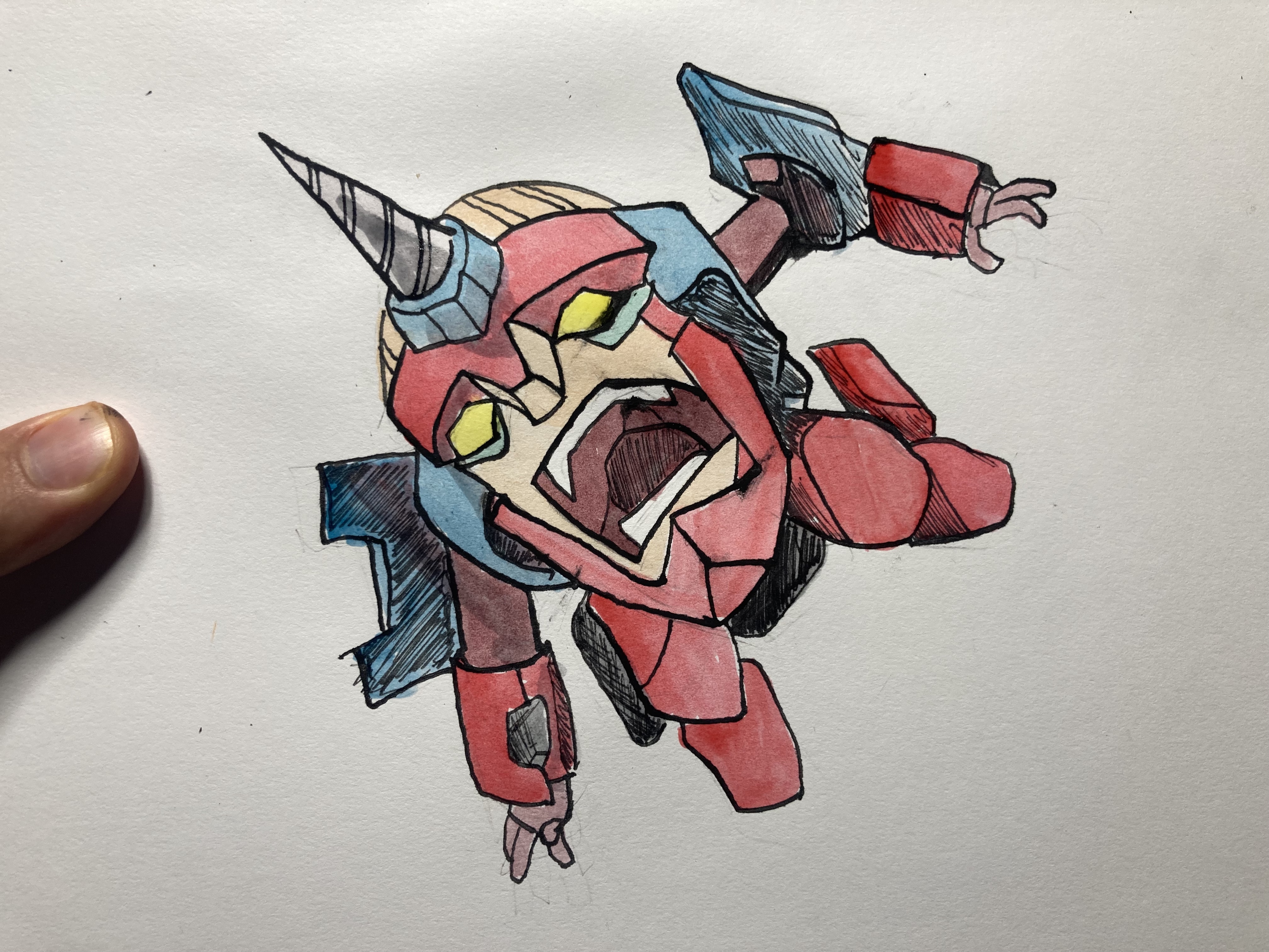 I recently rewatched through every episode of Gurren Lagann- it’s a robot anime where love inspires willpower that powers big robots, then they battle against despair and an uncaring and nihilistic universe. If you think that sentence is a lot to take, well, the show is basically gratuitous in every way- the dialogue, the animation style, the fan-service, the fights, the plot, it’s all so over-the-top but unironically so, it just leans into it, and I LOVE IT. I cry like every three episodes. I drew this pic of Lagaan (the main robot) from a still taken from the anime’s intro, and i think the drawing turned out great. The show has a bit of a sketchy look when it gets inense, so my unpolished drawing style is up for the task! I put a shorter version of this video on instagram if you’re interested in watching, but not in watching for 10 mins.