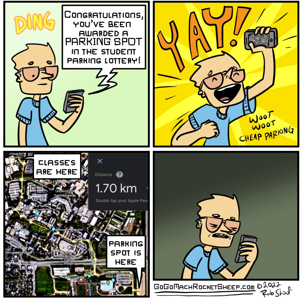 Who knew that out of all the big life changes of the last three months, parking would be the insurmountably annoying obstacle that would nearly derail me? I have a parking spot! This is really good news, and I’m really thankful. Once the winter comes and the snow piles up and the parking spots diminish, it’s nice knowing that I have a spot that’s bought and paid for… Although it’s a chilly 1.7 km to where my classes are. To be fair though, it’s probably only 0.5km to where I can start walking indoors through the crazy maze that is the uSask tunnels and catwalks and whatever to wind from building to building without having to be outside. Again- just thankful to have a spot.