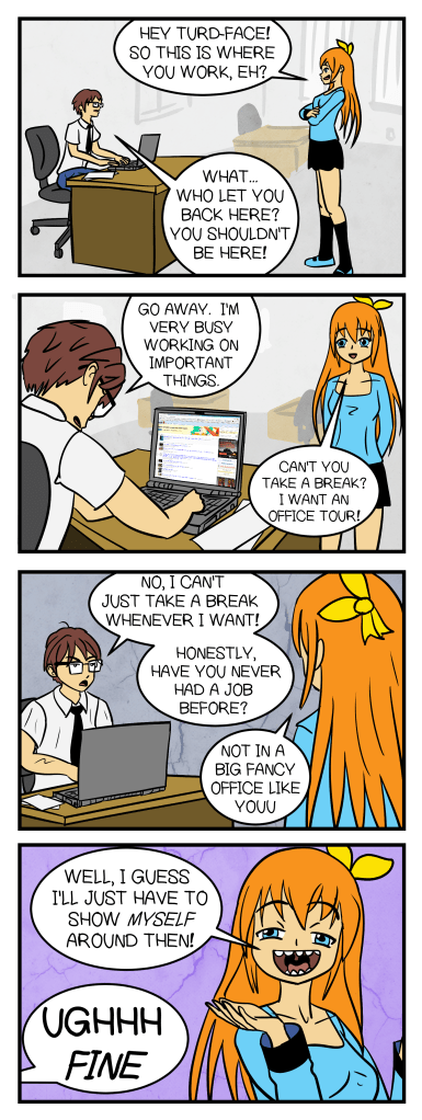 Huh! I thought I for sure made more than 3 comic strips this week. Odd. I guess that, in my prime comic making time, I DID assemble a couch- one of those “comfy” sectional couches that comes in 9 boxes and you put together each little section one at a time. If you ever wanna buy a sectional but you have a weird stair case that doesn’t allow for large furniture, I highly recommend it! It IS comfy. So it’s aptly named.