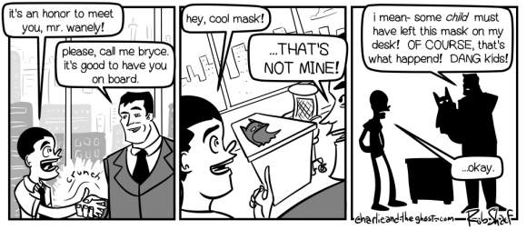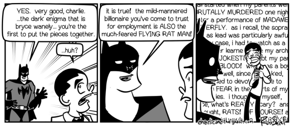 I didn’t make ANY comics this week! OH THE HORROR! It’s paper writing time- and I’m a slow writer. Anyways, here’s probably my FAVOURITE Charlie and the Ghost continuity I’ve ever written: The ADVENTURES of FLYING RAT MAN! It’s a bit of a longer read so BUCKLE UP: