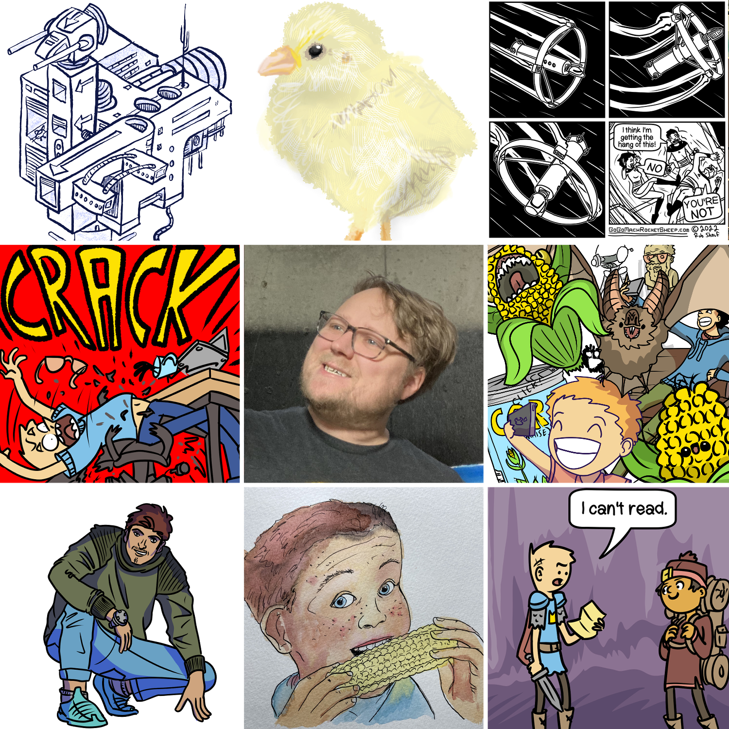 People at cloudscape were posting their Art VS Artist to the discord, and I figured I might as well jump in! It’s been a fun year of comic making and art drawing. Three of those panels are art I’ve made for ‘Let’s Draw’ videos, three of the panels are from comic strips I’ve made, and two of them are art I just made for the fun of it (the space station is drawn on my ReMarkable2, the sweater dude is drawn on my Huion which I also want to make a video of!). I started making ‘Let’s Draw’ videos for a few overlapping reasons, but one reason was to get myself drawing stuff I wouldn’t normally draw. It’s worked! haha. Corn kid is probably one of my favourite drawings/paintings I’ve ever done.