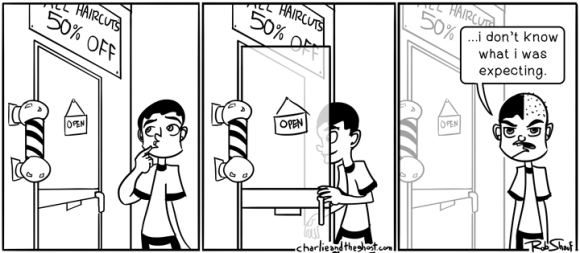 I was browsing around my website the other day and stumbled upon the very first graphic novel I ever produced. The art is rough, the story is barely a story, but there are some pretty good jokes in there! Check it out if you’ve got a half an hour to kill. Here is an example of a joke from the first few pages that I still think is pretty great. The context is that Charlie is working at an abandoned coffee shop:
