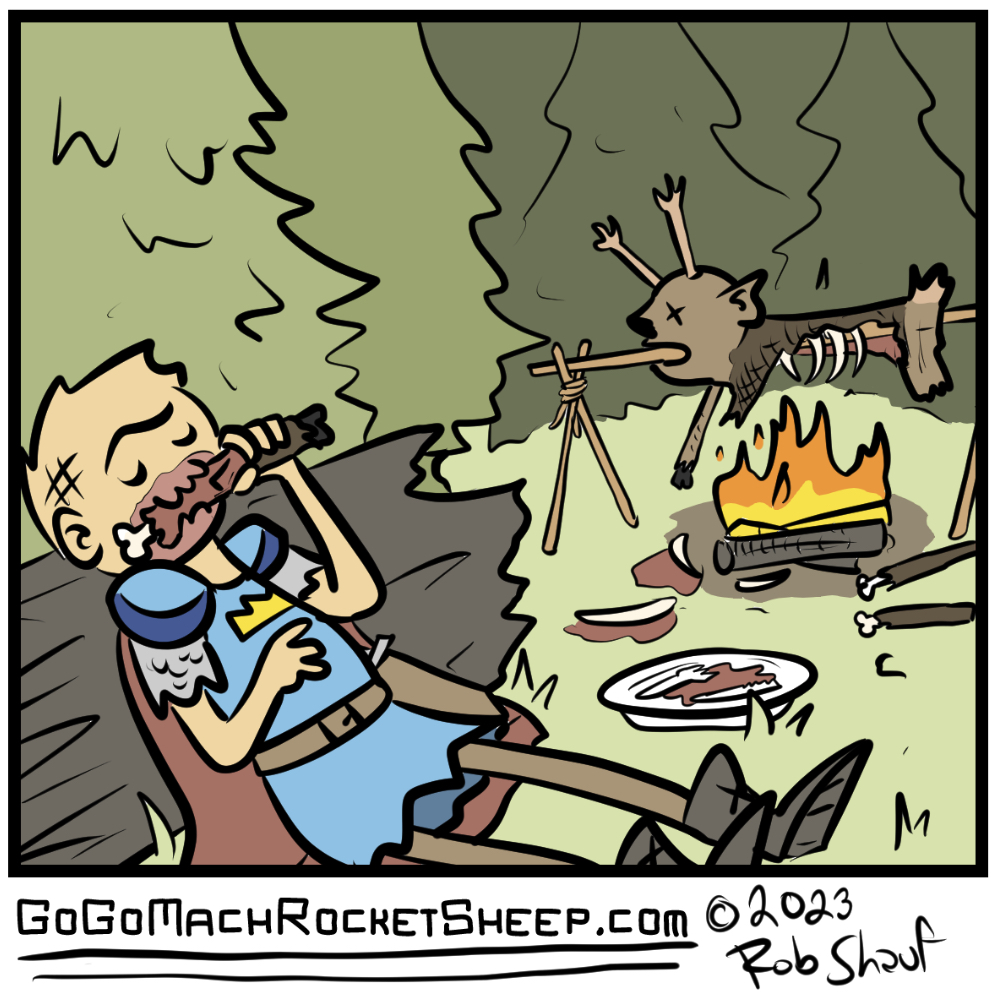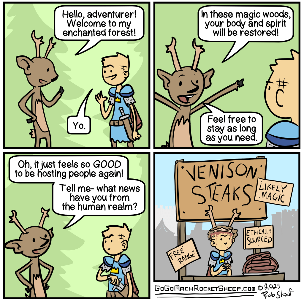I sketched it, ink’d it, coloured it, and thought, nah… It was sorta fun to draw, but it’s not funny. It’s just sort of gross. It doesn’t punch. So, instead, I went with the one that is actually on the comic. I think a venison booth is a funny way to end the comic. I think “ethically sourced” is really funny, when it is clear that our hero just murdered a hospitable magic deer. Reactions were mixed- some thought it was funny, some thought it’s sociopathic. One of my favourite scenes in the sitcom “community” is where Jeff Winger names a pencil, breaks the pencil, and everyone feels sad, because (he argues) we (for better or for worse) have the capability to personify and read meaning into anything. So, I hope you find that comic funny- if you don’t, well, just remember: it’s only a comic. No sociopathy involved here at all. Well, maybe the hero has sociopathic tendencies. Don’t all heroes?