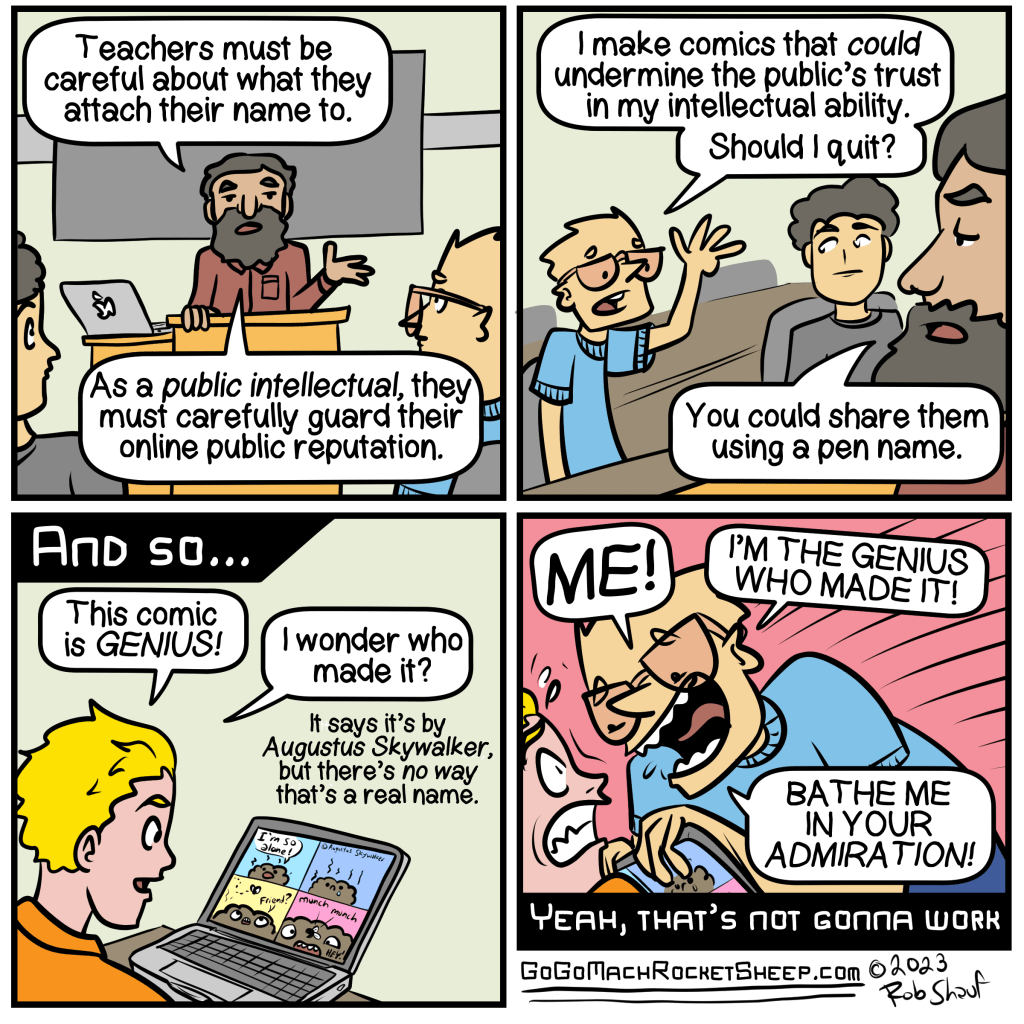 The ‘pen name’ situation I’ve articulated in the last comic is exactly accurate: I don’t think that would work for me. I’ve come to realize that I get equal parts satisfaction MAKING and SHARING the comic. I don’t think I’d feel satisfied if Augustus Skywalker was getting the credit for something I made, even if it is only a handful of likes on facebook, or a few hundred upvotes on reddit, or whatever. Vanity, thy name is: Shauf.
