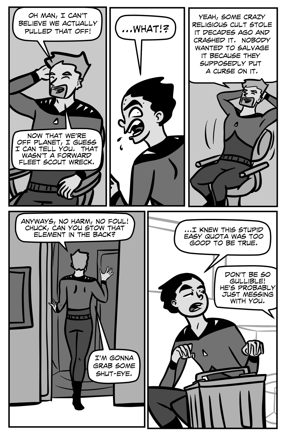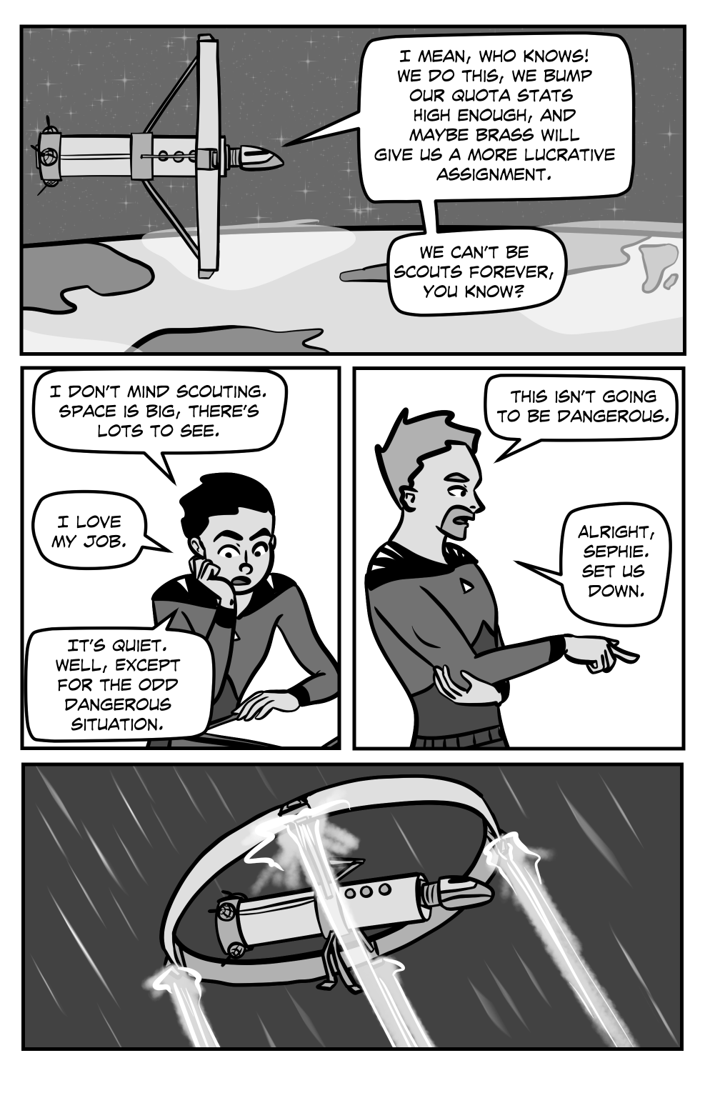 As a part of my website redesign, I’ll be moving my SPACE CHUCK chapters over to the website proper. I started making this comic in 2018, posted the chapters throughout 2019, and right as I was finishing it up, they announced “the lower decks” which was essentially the niche space I was hoping to fill: a comic/cartoon answering the question “what if Star Trek was funny?” And I LOVE the Lower decks. Throughout the course of me developing this story, it took on a bit of a life of it’s own. There are 10 original chapters that I gathered into a graphic novel, and then there are a bunch of short stories as well that I’m excited to post for (basically) the first time! I hope you’ll read along with me. 😀