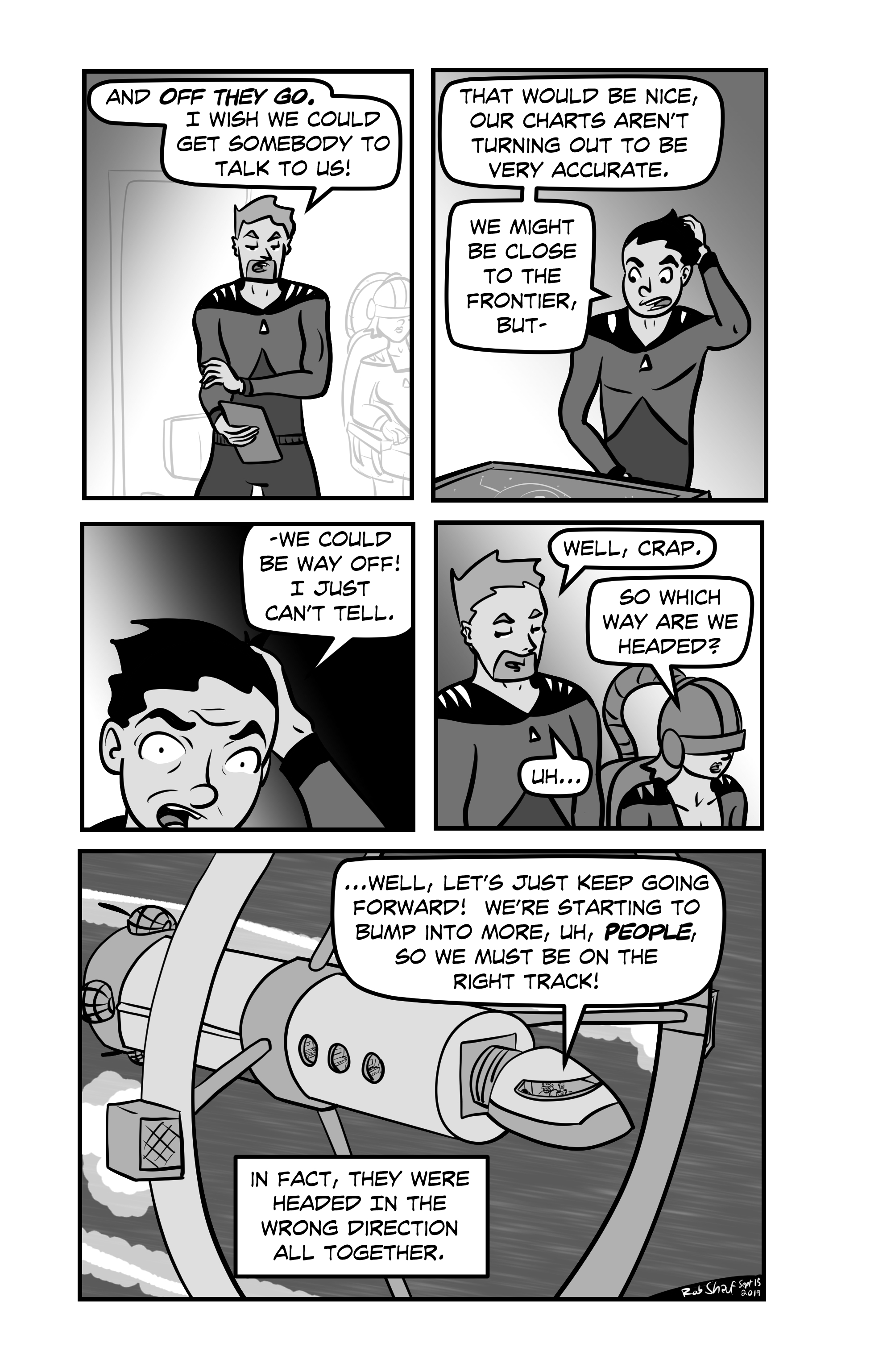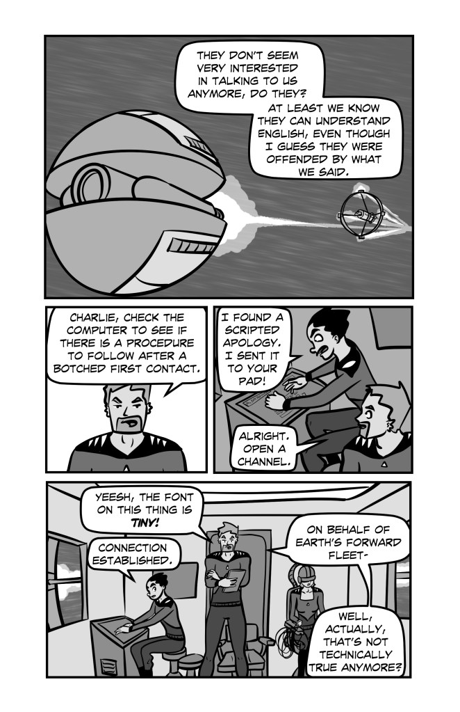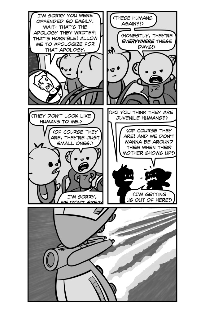 This is the last chapter of SPACE CHUCK that I ever made. There are additional strips, but they are just one-off gag jokes and don’t really contribute to any story. The story does wrap up, but on the extremely off-chance that I ever decide to finish the book, I think I’ll keep it to myself for now! 😉