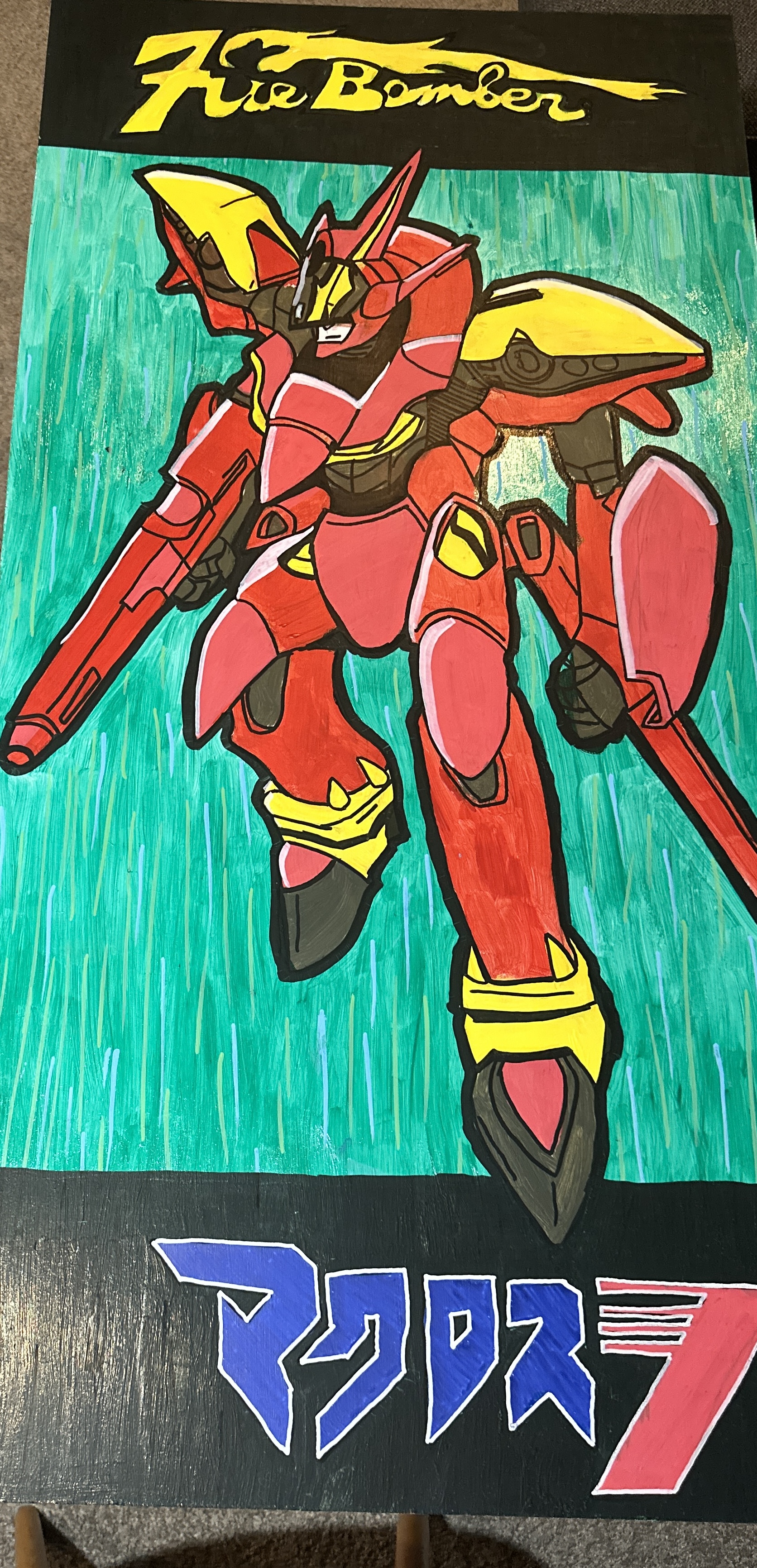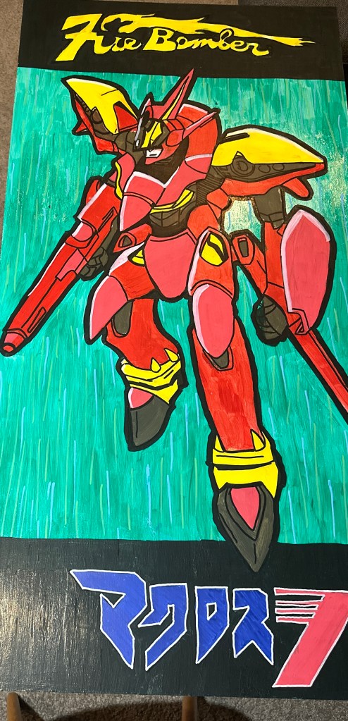 And just in case you wanted to see the painting, it’s a robot from Macross 7. I actually forgot to take a photo of it when it was done, but here is a progress shot. It was 4ft by 2ft and was a ton of fun to make! Acrylic, Posca, ink and medium.