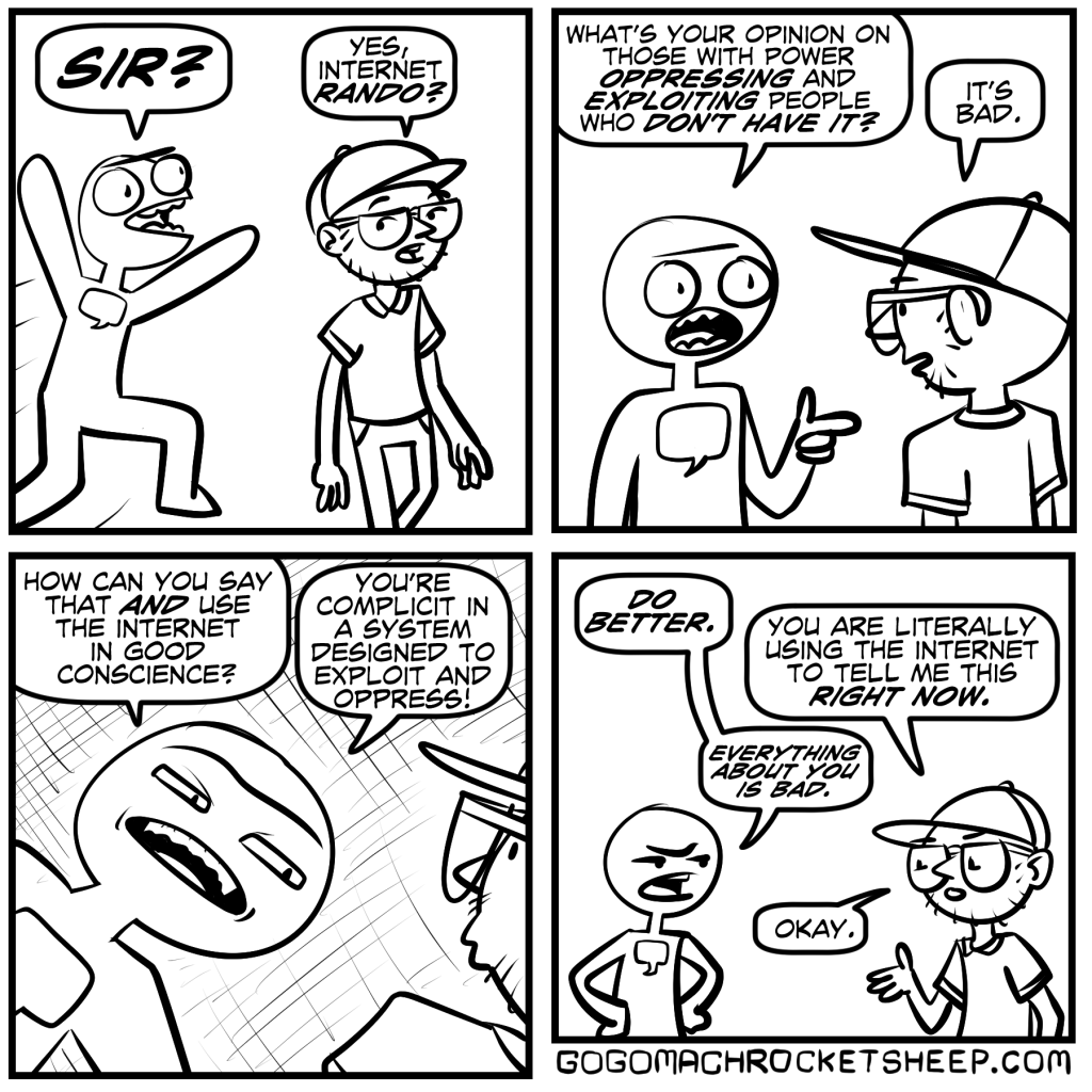 This is about as preachy as I get these days. Back when I was a preacher, I’d get more preachy, but these days, I just make grumpy comics about real internet conversations I’ve had featuring anonymous characters making straw man arguments. Somebody’s gotta tilt at all these windmills, you know?!
