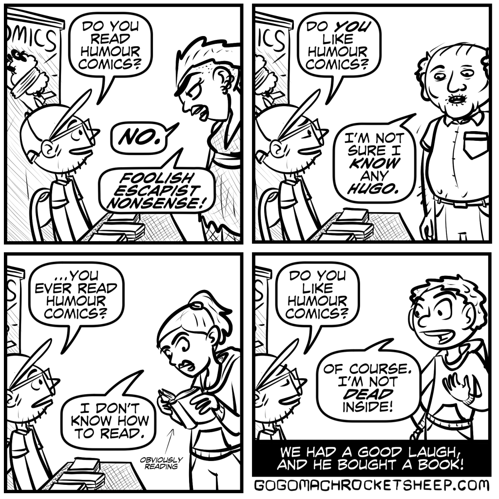 No two conventions are alike- especially when you consider the variety of people who attend, all for different reasons. The one convention I was recently at was a part of a town-wide fair style event, and many people came and browsed simply to get out of the crazy amounts of rain! But whatever the reason, when a person picks up a book and smirks, that’s okay by me.
