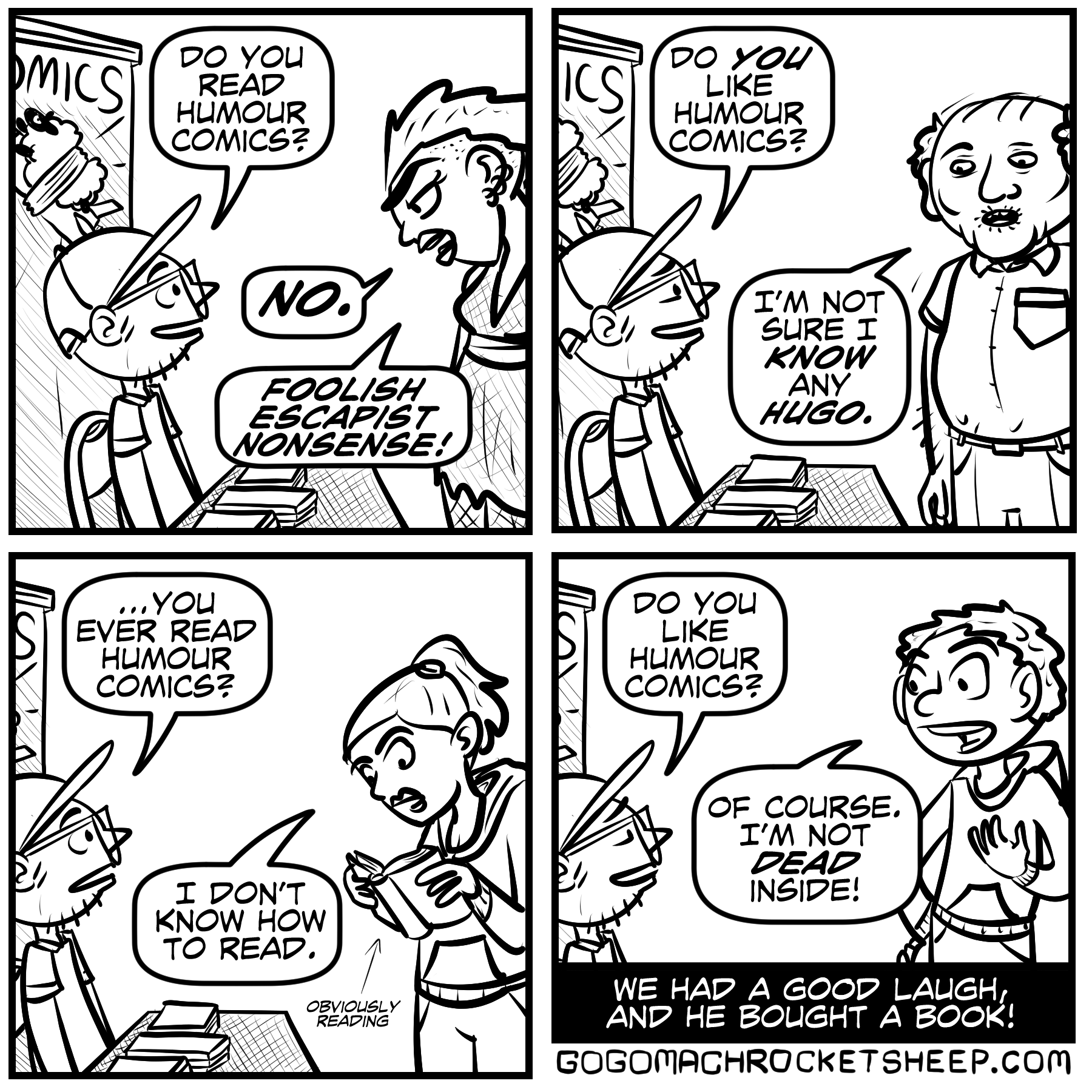 No two conventions are alike- especially when you consider the variety of people who attend, all for different reasons. The one convention I was recently at was a part of a town-wide fair style event, and many people came and browsed simply to get out of the crazy amounts of rain! But whatever the reason, when a person picks up a book and smirks, that’s okay by me.