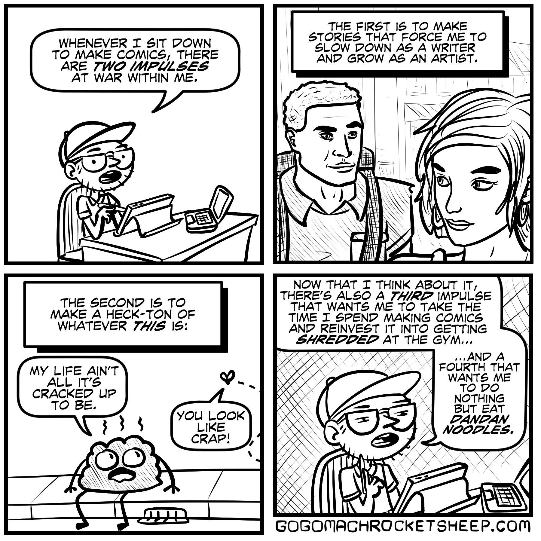 Recently, I’ve had a few people ask me questions about my comic making. I’m literally HORRIBLE at answering questions about this, because it’s more of a compulsion and less of an “activity informed by a well articulated artist statement”. I guess the comic strips in this update are an attempt to articulate some of why I do what I do.